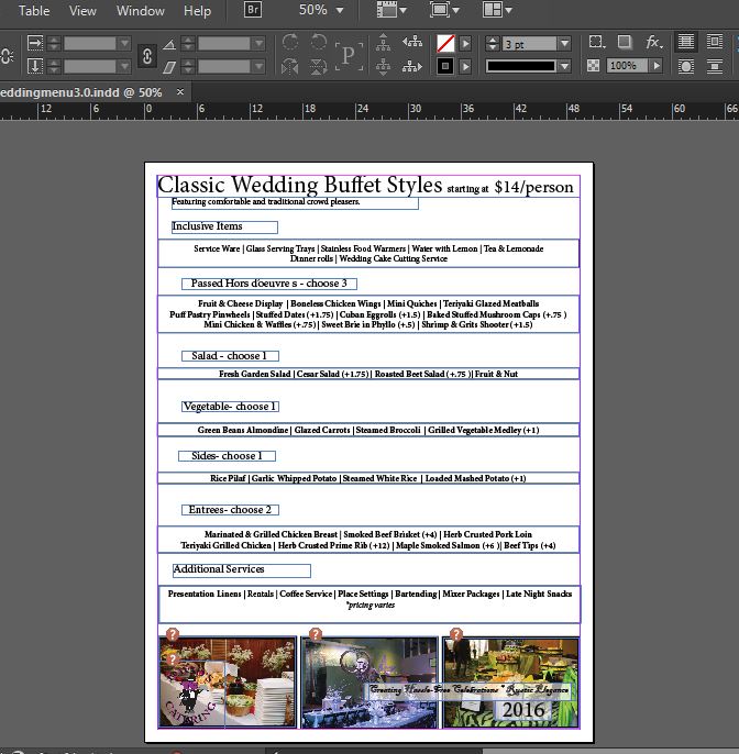 We already had our BBQ catering menu that we were handing out and when we first started attending bridal shows we also were telling people about all this stuff we could do, accompanied by a list of additional items. Just a list, no prices, no pictures, no logos. What were we thinking?!